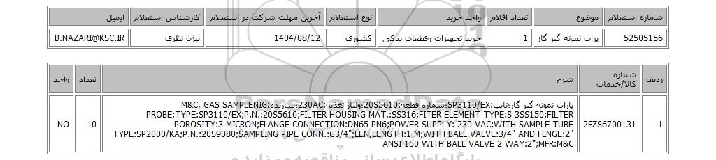 52505156پراب نمونه گیر گاز1خرید تجهیزات وقطعات یدکیکشوری1404/08/12بیژن نظریB.NAZARI@KSC.IR