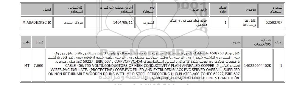 52503797کابل ها ورساناها1خرید مواد مصرفی و اقلام عمومیکشوری1404/08/11مزدک اسدیM.ASADI@KSC.IR