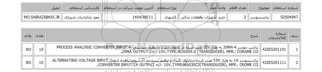 52504947ترانسدیوسر2خرید تجهیزات وقطعات یدکیکشوری1404/08/11محمد بابانژادیان شیرازیMO.SHIRAZI@KSC.IR