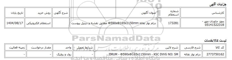 | محمد جاودان مهر - 05141522318 | 173281 | درام نوار نقاله Φ590xΦ165x1150mm مطابق نقشه و دیتیل پیوست | استعلام الکترونیکی | 1404/08/17 |