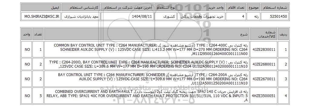 | 52501450 | رله | 4 | خرید تجهیزات وقطعات یدکی | کشوری | 1404/08/11 | محمد بابانژادیان شیرازی | MO.SHIRAZI@KSC.IR |
