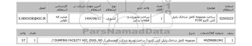 | 52505223 | ساخت مجموعه کامل شاخک پاتیل کش کایرو P100 | 1 | ساخت تجهیزات و قطعات یدکی | کشوری | 1404/08/11 | عنایت اله نکوئی | E.NEKOOIE@KSC.IR |