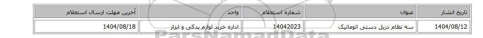 | 1404/08/12 | سه نظام دریل دستی اتوماتیک | 14042023 | اداره خرید لوازم یدکی و ابزار | 1404/08/18 |