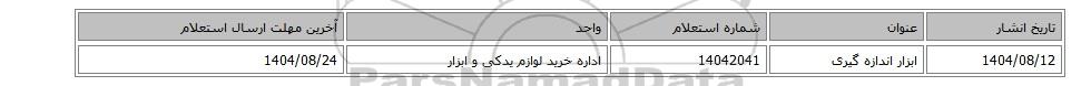 | 1404/08/12 | ابزار اندازه گیری | 14042041 | اداره خرید لوازم یدکی و ابزار | 1404/08/24 |