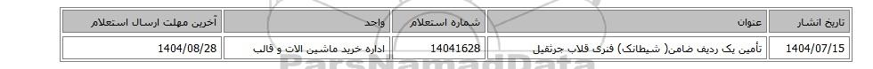 | 1404/07/15 | تأمین یک ردیف ضامن( شیطانک) فنری قلاب جرثقیل | 14041628 | اداره خرید ماشین الات و قالب | 1404/08/28 |