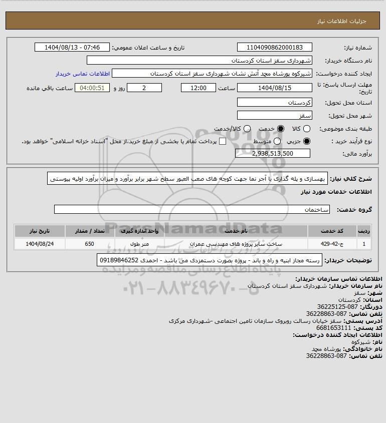 استعلام بها و موضوع استعلام استعلام بهسازی و پله گذاری با آجر نما جهت کوچه های صعب العبور سطح شهر برابر برآورد و میزان برآورد اولیه پیوستی به اطلاع کلیه شرکت‌ها و افراد متخصص واجد شرایط می‌رساند، آگهی گذار در نظر دارد از طریق استعلام بها، نسبت به انتخاب و دریافت پیشنهادات اقدام نماید. این استعلام با کد آگهی ثبت شده در سامانه خبرگزاری پارس نماد : 9796954 منتشر شده است. مشخصات استعلام : تاریخ شروع استعلام: 1404/08/13 آخرین مهلت ارسال پیشنهاد قیمت : 1404/08/15 و محل اجرای پروژه : استان کردستان میباشد. استعلام قیمت مورد درخواست : استعلام بهسازی و پله گذاری با آجر نما جهت کوچه های صعب العبور سطح شهر برابر برآورد و میزان برآورد اولیه پیوستی با دسته‌بندی‌های تخصصی و گروه های مرتبط : راهسازی, ساختمان, استعلام اطلاع رسانی میگردد.