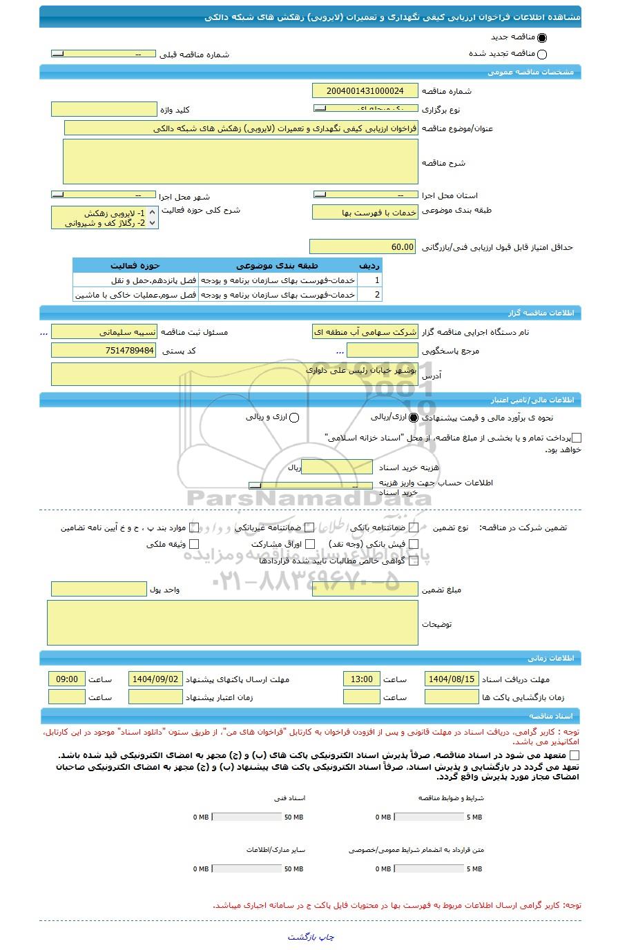 | شماره مناقصه | 2004001431000024 | |||||||||||
