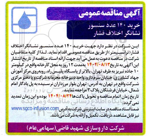 این شرکت در نظر دارد جهت خرید 140 عدد سنسور نشانگر اختلاف فشار (ترانسیمتر) از طریق مناقصه عمومی اقدام نماید. لذا از کلیه متقاضیان شرکت در مناقصه دعوت به عمل می آید جهت ارائه اسناد مناقصه از تاریخ انتشار این آگهی به تاریخ 1404.08.13 به مدت 12 روز به محل کارخانه واقع در کیلومتر 10 جاده تبریز به طرف تهران بالاتر از پاسگاه پلیس راه روبه روی مرکز آموزش جهاد کشاورزی، خیابان سرم دارو واحد دبیرخانه محرمانه شرکت و یا دفتر مرکزی شرکت واقع در تهران به آدرس تهران ، بلوار مرزداران، نرسیده به پل یادگار امام ، شمال خیابان فرشتگان ، پلاک 3 مراجعه نمایند.