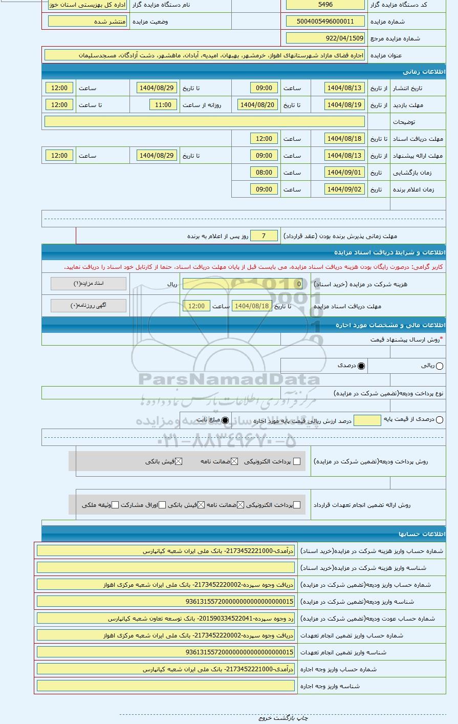 عنوان مزایدهاجاره فضای مازاد شهرستانهای اهواز، خرمشهر، بهبهان، امیدیه، آبادان، ماهشهر، دشت آزادگان، مسجدسلیمان