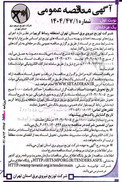 شرکت توزیع نیروی برق استان تهران (منطقه رباط کریم) در نظر دارد اجرای پروژه های توسعه، احداث و بهینه سازی شبکه های توزیع (بر اساس طرح) را با توجه به شرایط مندرج در اسناد از طریق برگزاری مناقصه عمومی یک مرحله ای به شرکت های واجد شرایط به شرح ذیل واگذار نماید.