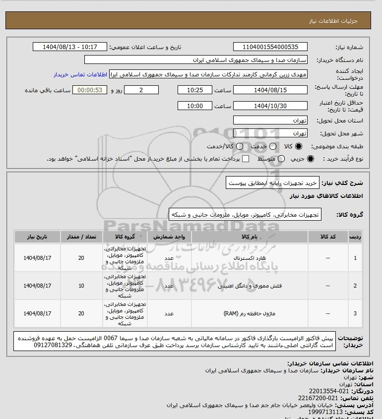 نام دستگاه خریدار:سازمان صدا و سیمای جمهوری اسلامی ایران