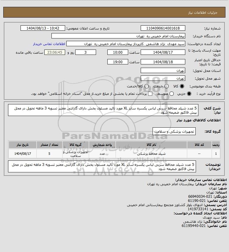 شرح کلی نیاز: 5 عدد شیلد محافظ سربی لباس یکسره سایز XL مورد تائید مسئول بخش دارای گارانتی معتبر تسویه 3 ماهه تحویل در محل پیش فاکتور ضمیمه شود