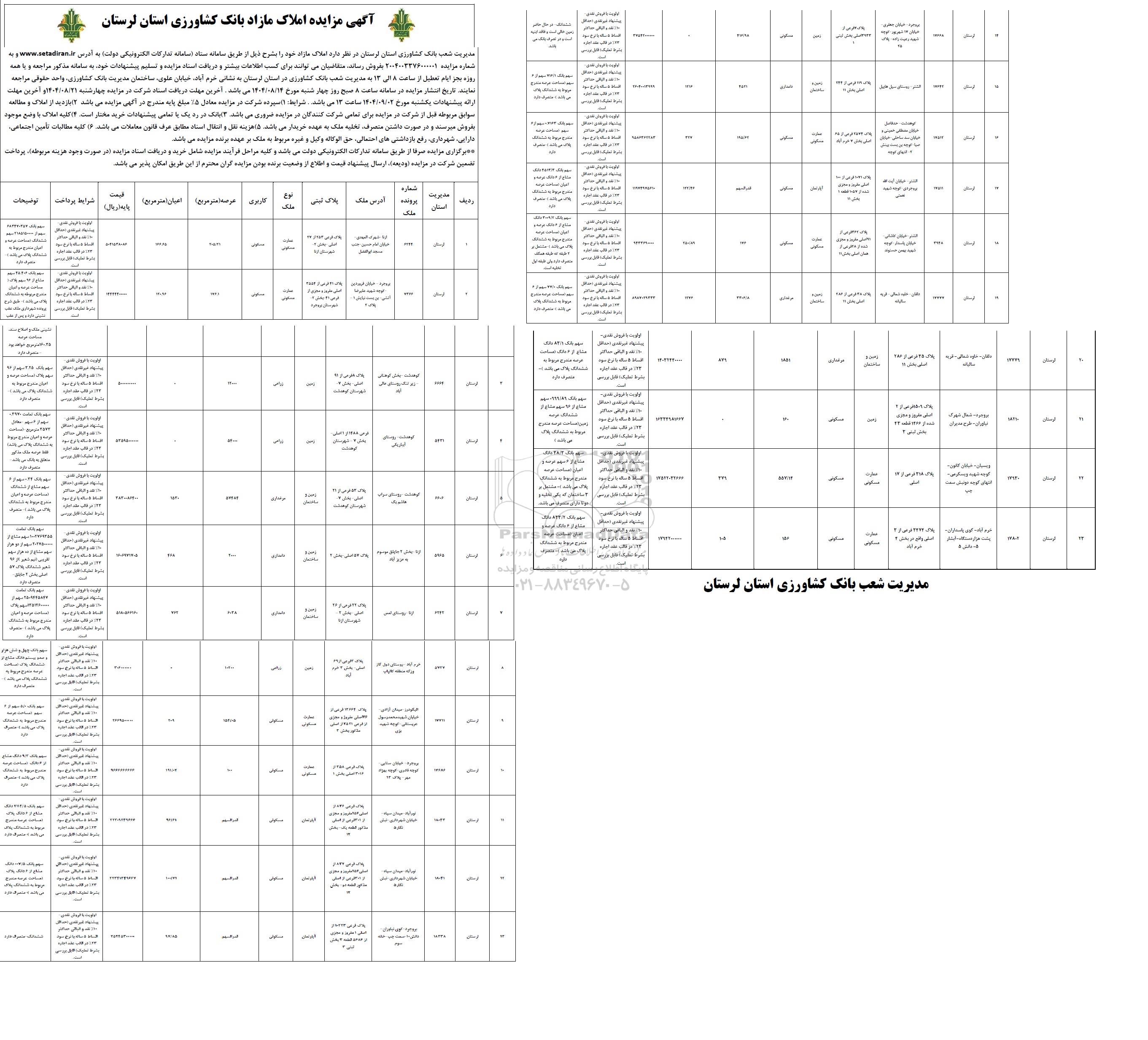 آگهی مزایده املاک مازاد بانک کشاورزی استان لرستان