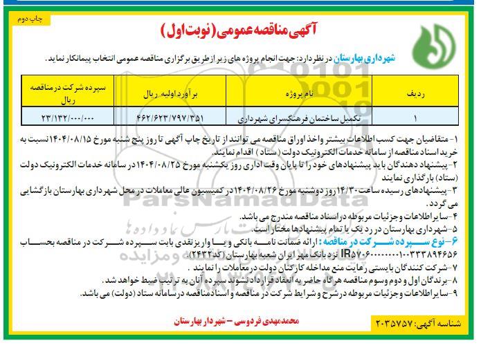 مناقصه تکمیل ساختمان فرهنگسرای شهرداری نوبت اول چاپ دوم از کلیه افراد متخصص و شرکتها واجد شرایط دعوت به عمل میآید در مناقصه با کد خبرگزاری پارس نماد: 9800183 شرکت نمایند.