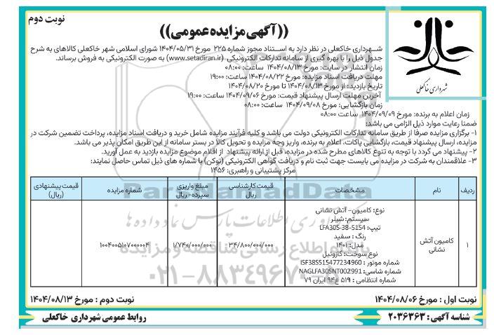 شهرداری خاکعلی در نظر دارد به استناد مجوز شماره 225 مورخ 1404.05.31 شورای اسلامی شهر خاکعلی کالاهای به شرح جدول ذیل را با بهره گیری از سامانه تدارکات الکترونیکی (سایت ستاد ایران) به صورت الکترونیکی به فروش برساند.