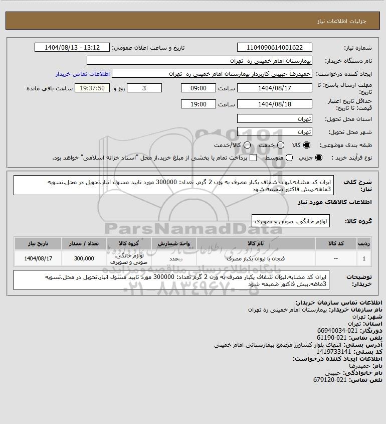 شرح کلی نیاز: ایران کد مشابه.لیوان شفاف یکبار مصرف به وزن 2 گرم. تعداد: 300000 مورد تایید مسول انبار.تحویل در محل.تسویه 3ماهه.پیش فاکتور ضمیمه شود