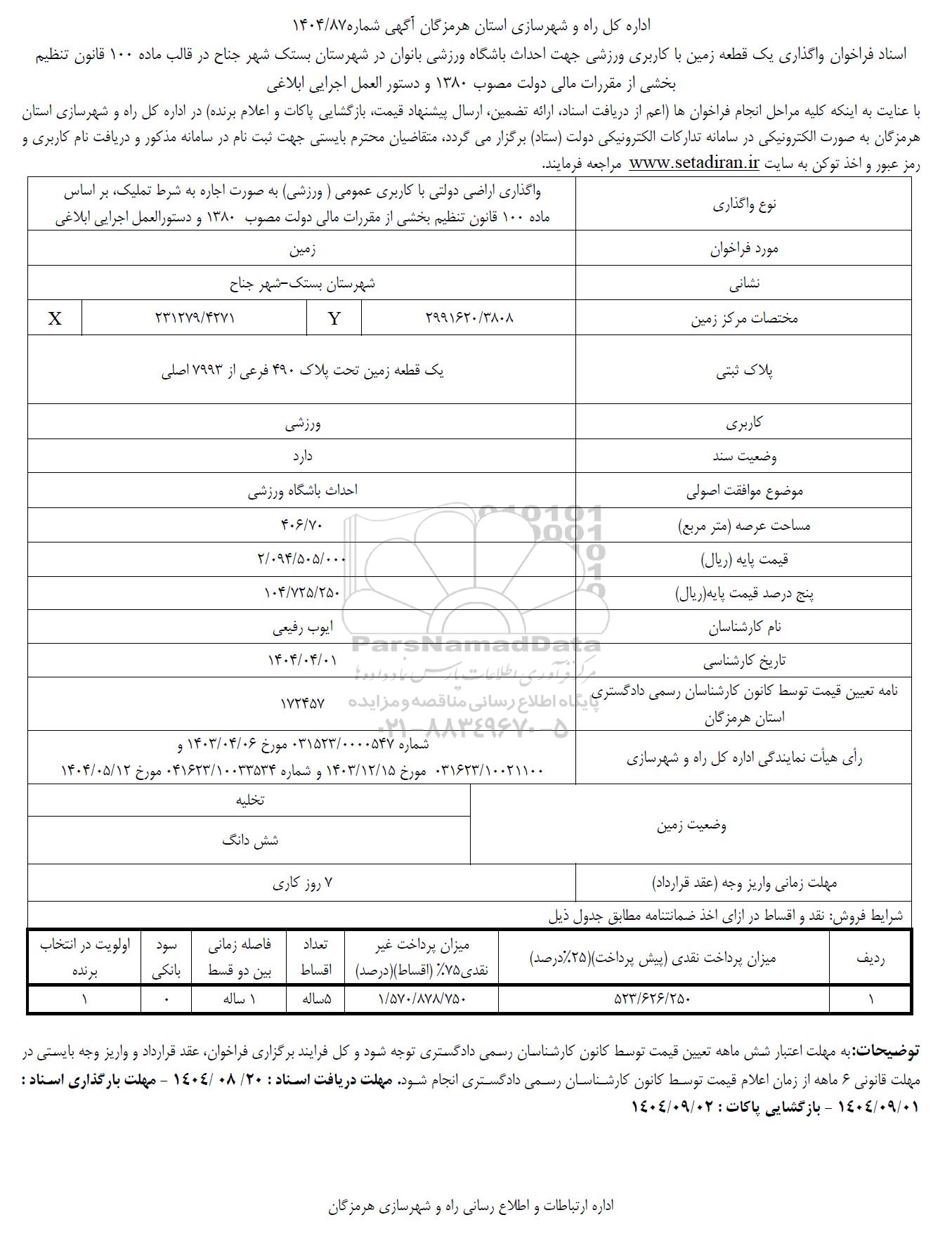 اسناد فراخوان واگذاری یک قطعه زمین با کاربری ورزشی جهت احداث باشگاه ورزشی بانوان در شهرستان بستک شهر جناح در قالب ماده 100 قانون تنظیم