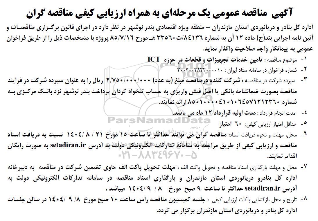 مناقصه تامین خدمات تجهیزات و قطعات در حوزه ICT از کلیه افراد متخصص و شرکتها واجد شرایط دعوت به عمل میآید در مناقصه با کد خبرگزاری پارس نماد: 9800561 شرکت نمایند.