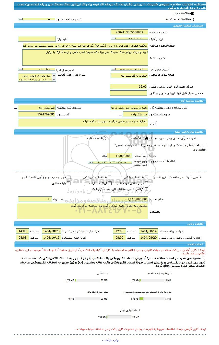 | زمان بازگشایی پاکت ها | 1404/08/29 | تا تاریخ | 08:00 | زمان اعتبار پیشنهاد | 1404/10/15 | تا ساعت | 08:08 |