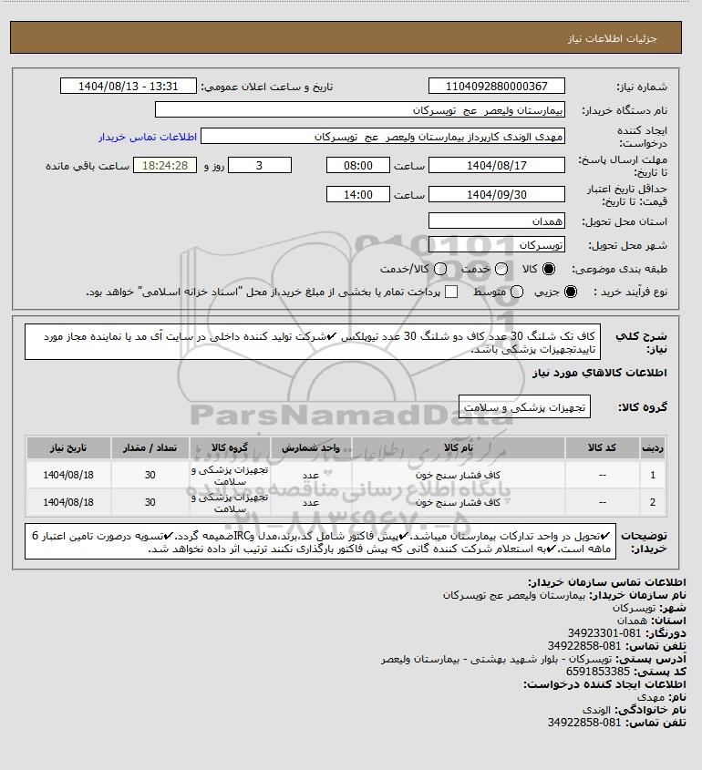 | 2 | -- | کاف فشار سنج خون | عدد | تجهیزات پزشکی و سلامت | 30 | 1404/08/18 |