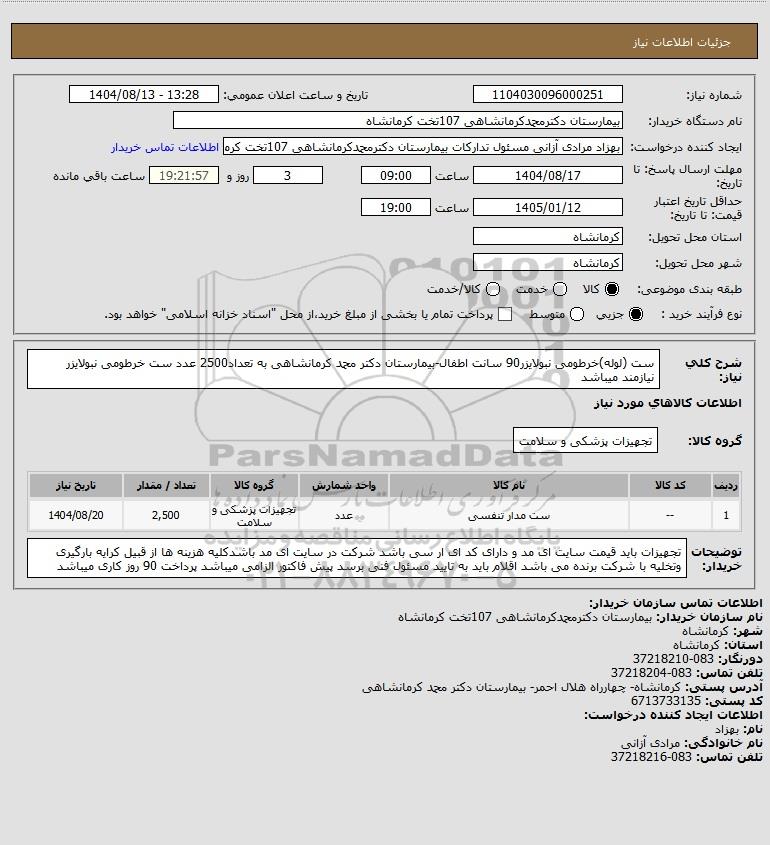 شرح کلی نیاز: ست (لوله)خرطومی نبولایزر90 سانت اطفال-بیمارستان دکتر محمد کرمانشاهی به تعداد2500 عدد ست خرطومی نبولایزر نیازمند میباشد