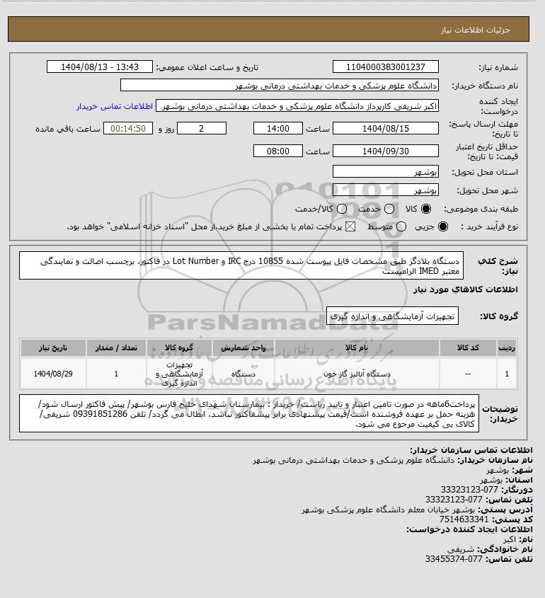 استعلام بها و موضوع استعلام استعلام دستگاه بلادگز طبق مشخصات فایل پیوست شده 10855 درج IRC و Lot Number در فاکتور، برچسب اصالت و نمایندگی معتبر IMED الزامیست به اطلاع کلیه شرکت‌ها و افراد متخصص واجد شرایط می‌رساند، آگهی گذار در نظر دارد از طریق استعلام بها، نسبت به انتخاب و دریافت پیشنهادات اقدام نماید. این استعلام با کد آگهی ثبت شده در سامانه خبرگزاری پارس نماد : 9800699 منتشر شده است. مشخصات استعلام : تاریخ شروع استعلام: 1404/08/13 آخرین مهلت ارسال پیشنهاد قیمت : 1404/08/15 و محل اجرای پروژه : استان بوشهر میباشد. استعلام قیمت مورد درخواست : استعلام دستگاه بلادگز طبق مشخصات فایل پیوست شده 10855 درج IRC و Lot Number در فاکتور، برچسب اصالت و نمایندگی معتبر IMED الزامیست با دسته‌بندی‌های تخصصی و گروه های مرتبط : خدمات و تجهیزات آزمایشگاهی و پزشکی, استعلام اطلاع رسانی میگردد. شرایط شرکت در استعلام آنلاین : ابتدا ثبت نام در سامانه استعلام پارس نماد و تکمیل مدارک موردنیاز و بارگذاری در سامانه رعایت تمامی ضوابط و الزامات مندرج در اسناد استعلام است.