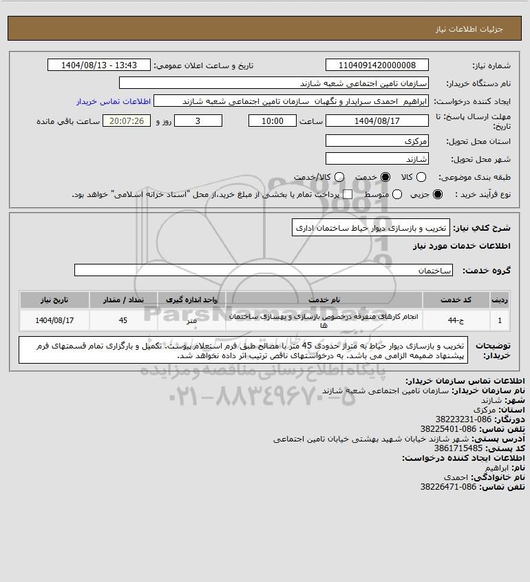 شرح کلی نیاز: تخریب و بازسازی دیوار حیاط ساختمان اداری