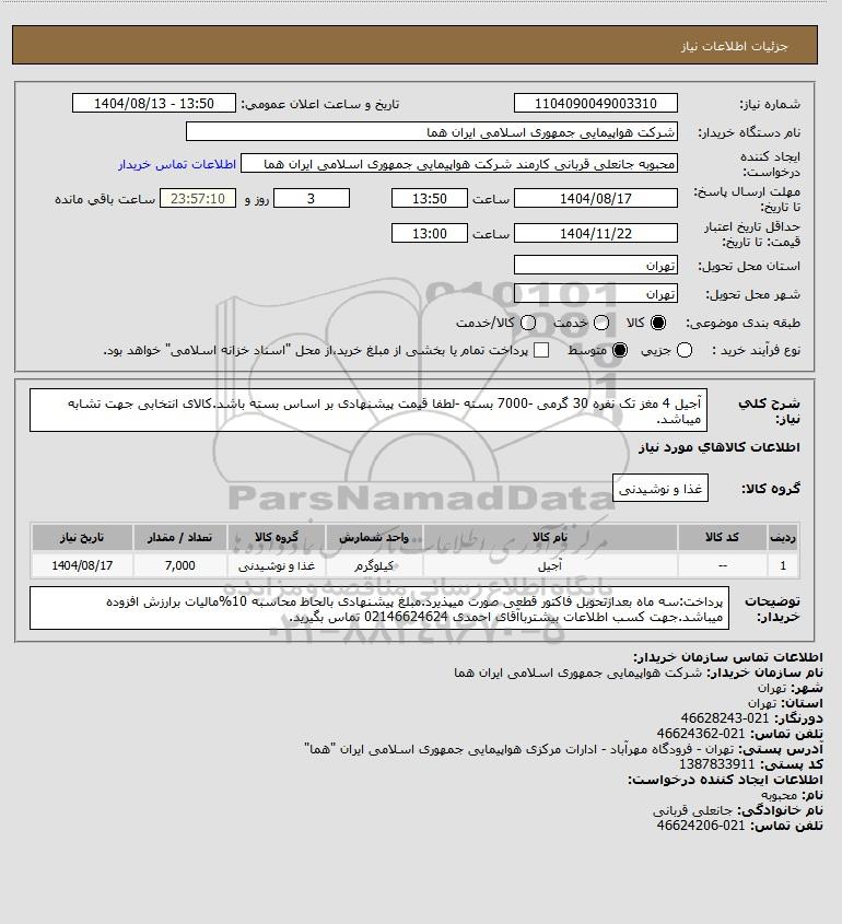 شرح کلی نیاز: آجیل 4 مغز تک نفره 30 گرمی -7000 بسته -لطفا قیمت پیشنهادی بر اساس بسته باشد.کالای انتخابی جهت تشابه میباشد.