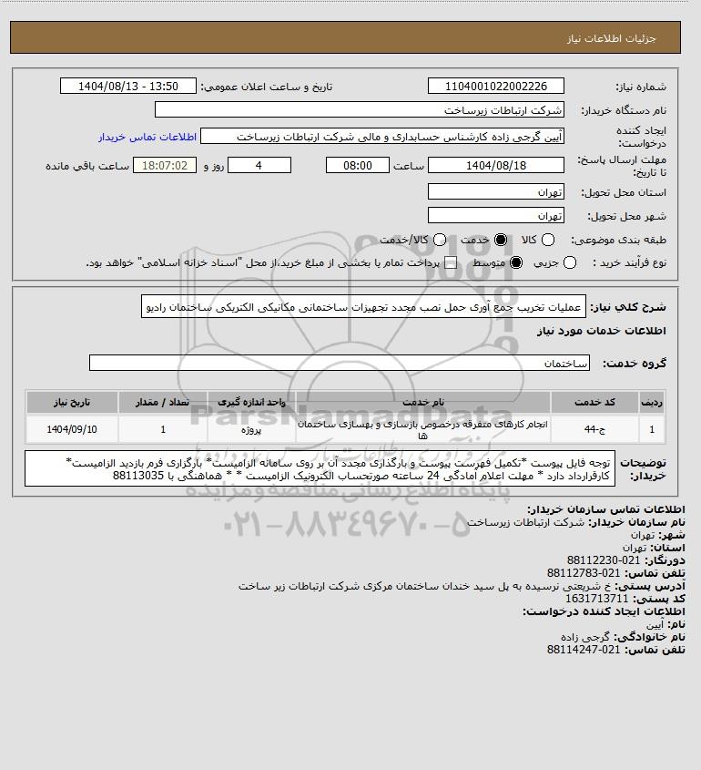 شرح کلی نیاز: عملیات تخریب جمع آوری حمل نصب مجدد تجهیزات ساختمانی مکانیکی الکتریکی ساختمان رادیو