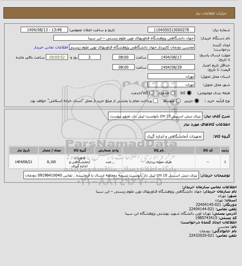 استعلام بها و موضوع استعلام استعلام پتری دیش استریل 10 cm بایوتست لیبل دار. تصویر پیوست به اطلاع کلیه شرکتها و افراد متخصص واجد شرایط میرساند، آگهی گذار در نظر دارد از طریق استعلام بها، نسبت به انتخاب و دریافت پیشنهادات اقدام نماید. این استعلام با کد آگهی ثبت شده در سامانه خبرگزاری پارس نماد : 9800799 منتشر شده است. مشخصات استعلام : تاریخ شروع استعلام: 1404/08/13 آخرین مهلت ارسال پیشنهاد قیمت : 1404/08/17 و محل اجرای پروژه : استان تهران میباشد. استعلام قیمت مورد درخواست : استعلام پتری دیش استریل 10 cm بایوتست لیبل دار. تصویر پیوست با دستهبندیهای تخصصی و گروه های مرتبط : خدمات و تجهیزات آزمایشگاهی و پزشکی, استعلام اطلاع رسانی میگردد.