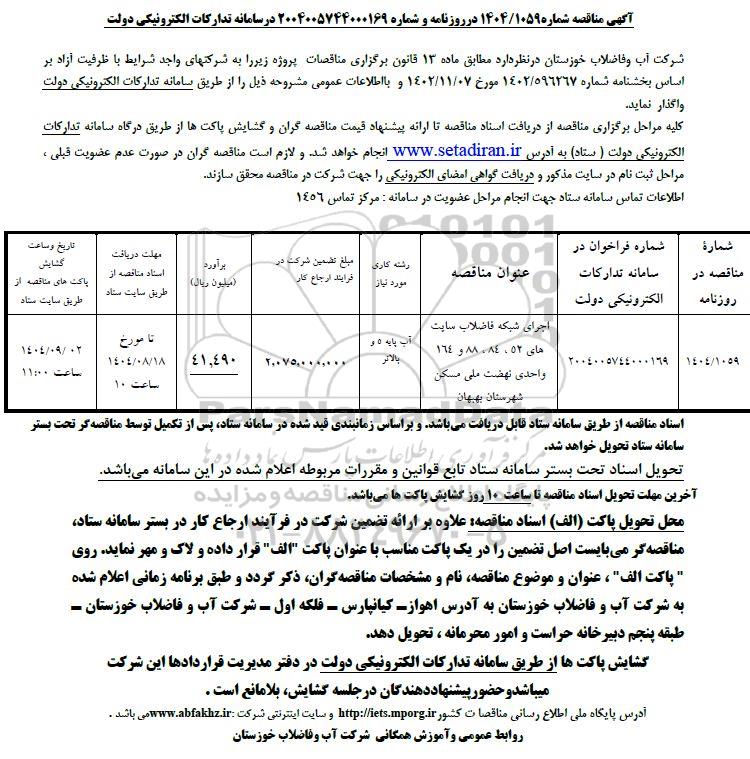 | 1404/1059 | 2004005744000169 | اجرای شبکه فاضلاب سایت های 52 ،84 ، 88 . 164 واحدی نهضت ملی مسکن شهرستان بهبهان | آب پایه 5 و بالاتر | 2.075.000.000 | 41.490 | تا مورخ 1404.8.18 ساعت 10 | تا مورخ 1404.9.2 ساعت 11 |