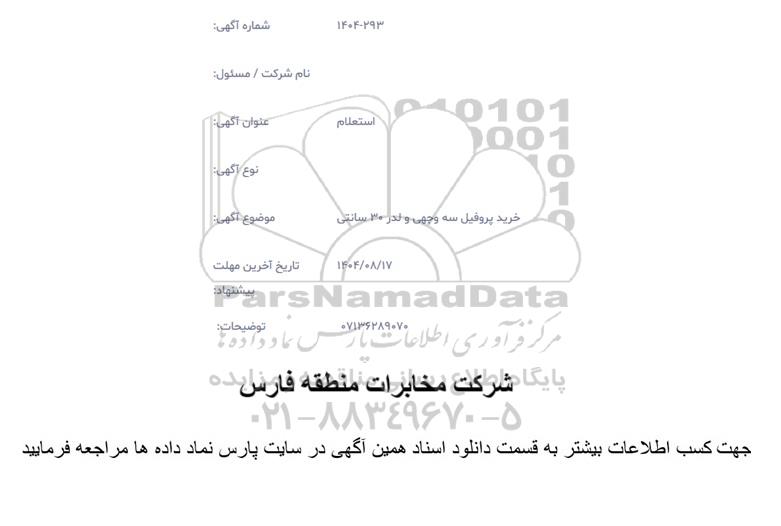 برای شرکت در مناقصه حتما از تصویر آگهی در سایت پارس نماد داده ها استفاده نمایید