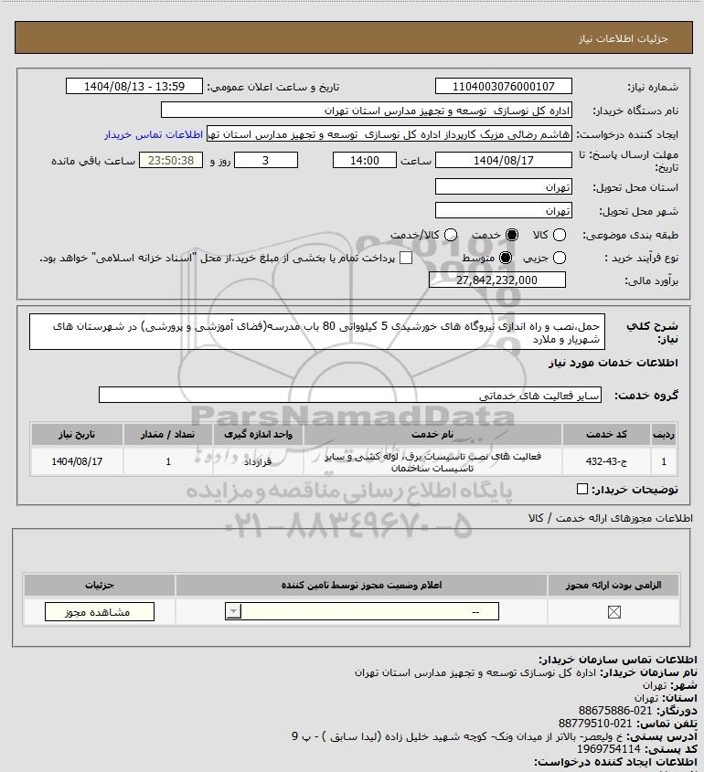 شرح کلی نیاز: حمل،نصب و راه اندازی نیروگاه های خورشیدی 5 کیلوواتی 80 باب مدرسه(فضای آموزشی و پرورشی) در شهرستان های شهریار و ملارد