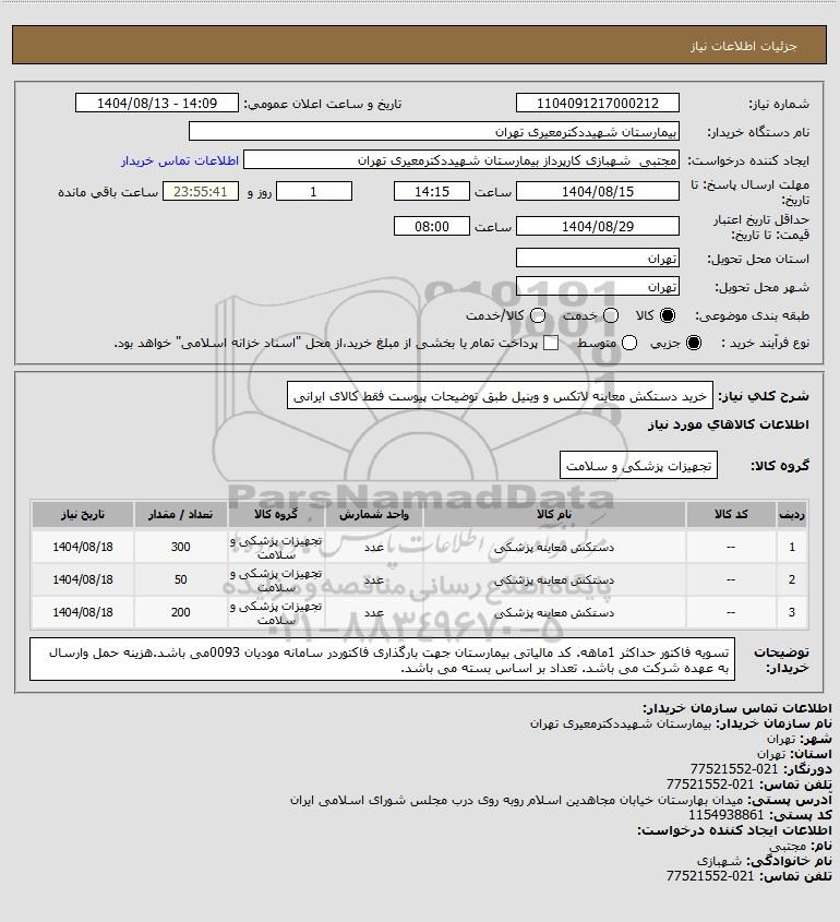شرح کلی نیاز: خرید دستکش معاینه لاتکس و وینیل طبق توضیحات پیوست فقط کالای ایرانی