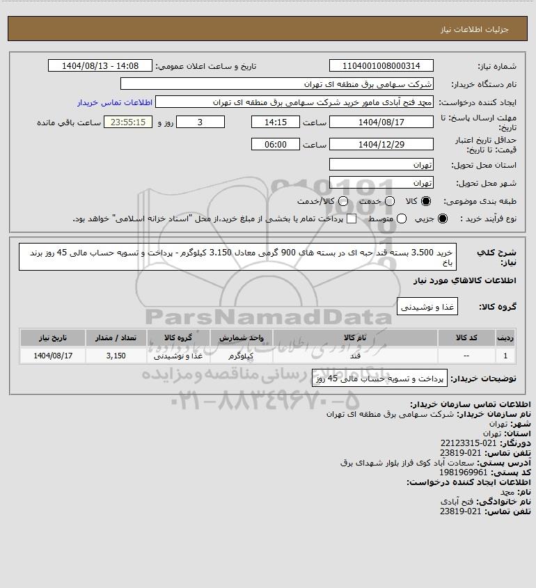 شرح کلی نیاز: خرید 3.500 بسته قند حبه ای در بسته های 900 گرمی معادل 3.150 کیلوگرم - پرداخت و تسویه حساب مالی 45 روز برند باخ