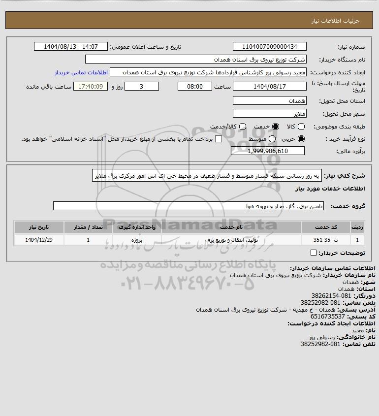 شرح کلی نیاز: به روز رسانی شبکه فشار متوسط و فشار ضعیف در محیط جی ای اس امور مرکزی برق ملایر