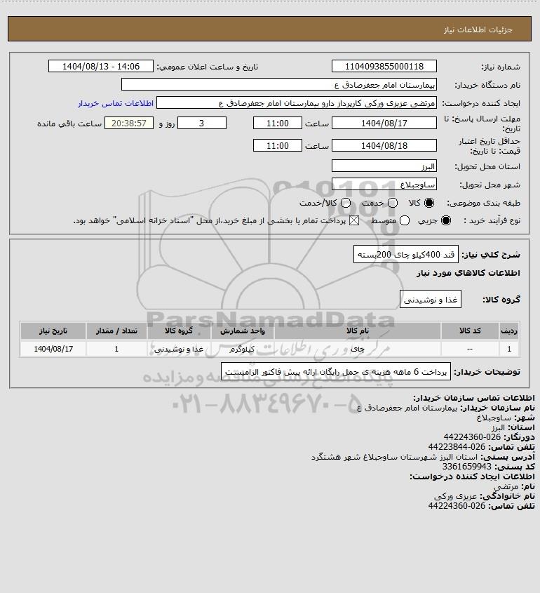 استعلام بها و موضوع استعلام استعلام قند 400کیلو چای 200بسته به اطلاع کلیه شرکتها و افراد متخصص واجد شرایط میرساند، آگهی گذار در نظر دارد از طریق استعلام بها، نسبت به انتخاب و دریافت پیشنهادات اقدام نماید. این استعلام با کد آگهی ثبت شده در سامانه خبرگزاری پارس نماد : 9800960 منتشر شده است. مشخصات استعلام : تاریخ شروع استعلام: 1404/08/13 آخرین مهلت ارسال پیشنهاد قیمت : 1404/08/17 و محل اجرای پروژه : استان البرز میباشد. استعلام قیمت مورد درخواست : استعلام قند 400کیلو چای 200بسته با دستهبندیهای تخصصی و گروه های مرتبط : مواد غذایی, چای, استعلام اطلاع رسانی میگردد.