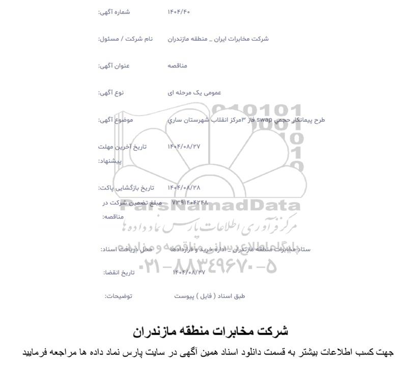 موضوع آگهی: طرح پیمانکار حجمی swap فاز 3 مرکز انقلاب شهرستان ساری