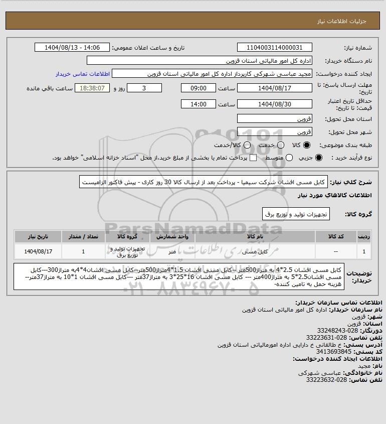 | 1 | -- | کابل مسی | متر | تجهیزات تولید و توزیع برق | 1 | 1404/08/17 |