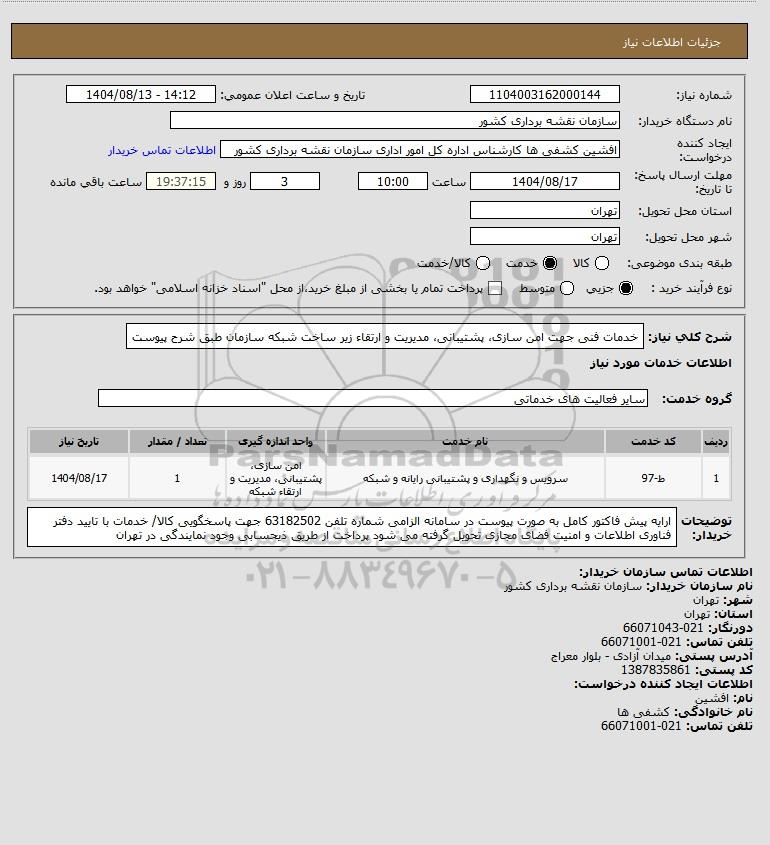 شرح کلی نیاز: خدمات فنی جهت امن سازی، پشتیبانی، مدیریت و ارتقاء زیر ساخت شبکه سازمان طبق شرح پیوست
