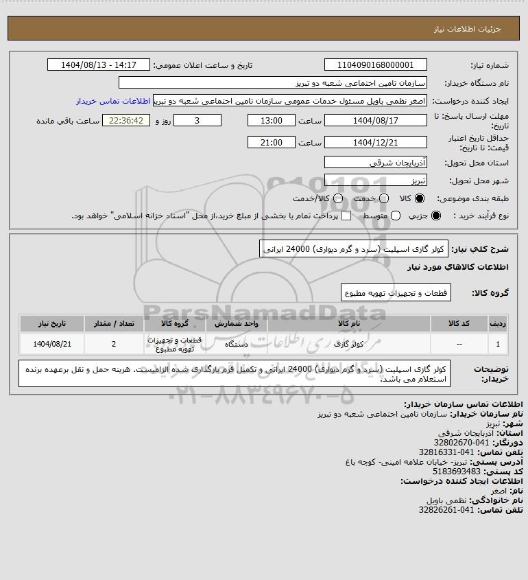 شرح کلی نیاز: کولر گازی اسپلیت (سرد و گرم دیواری) 24000 ایرانی