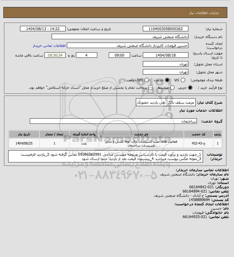 شرح کلی نیاز: مرمت سقف بالکن طی بازدید حضوری