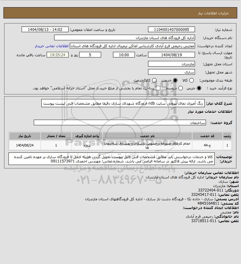 شرح کلی نیاز: رنگ آمیزی نمای بیرونی سایت ndb فرودگاه شهدای ساری دقیقا مطابق مشخصات فنی لیست پیوست