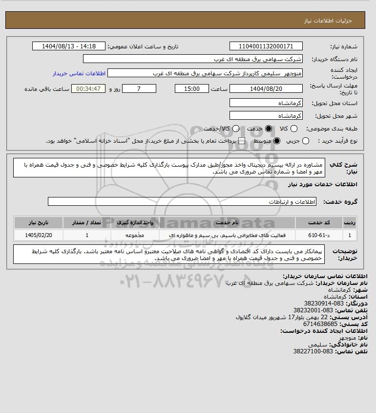 استعلام مشاوره در ارائه بیسیم دیجیتال واخذ مجوز/طبق مدارک پیوست بارگذاری کلیه شرایط خصوصی و فنی و جدول قیمت همراه با مهر و امضا و شماره تماس ضروری می باشد., استعلام مشاوره در ارائه بیسیم دیجیتال واخذ مجوز/طبق مدارک پیوست بارگذاری کلیه شرایط خصوصی و فنی و جدول قیمت همراه با مهر و امضا و شماره تماس ضروری می باشد.
