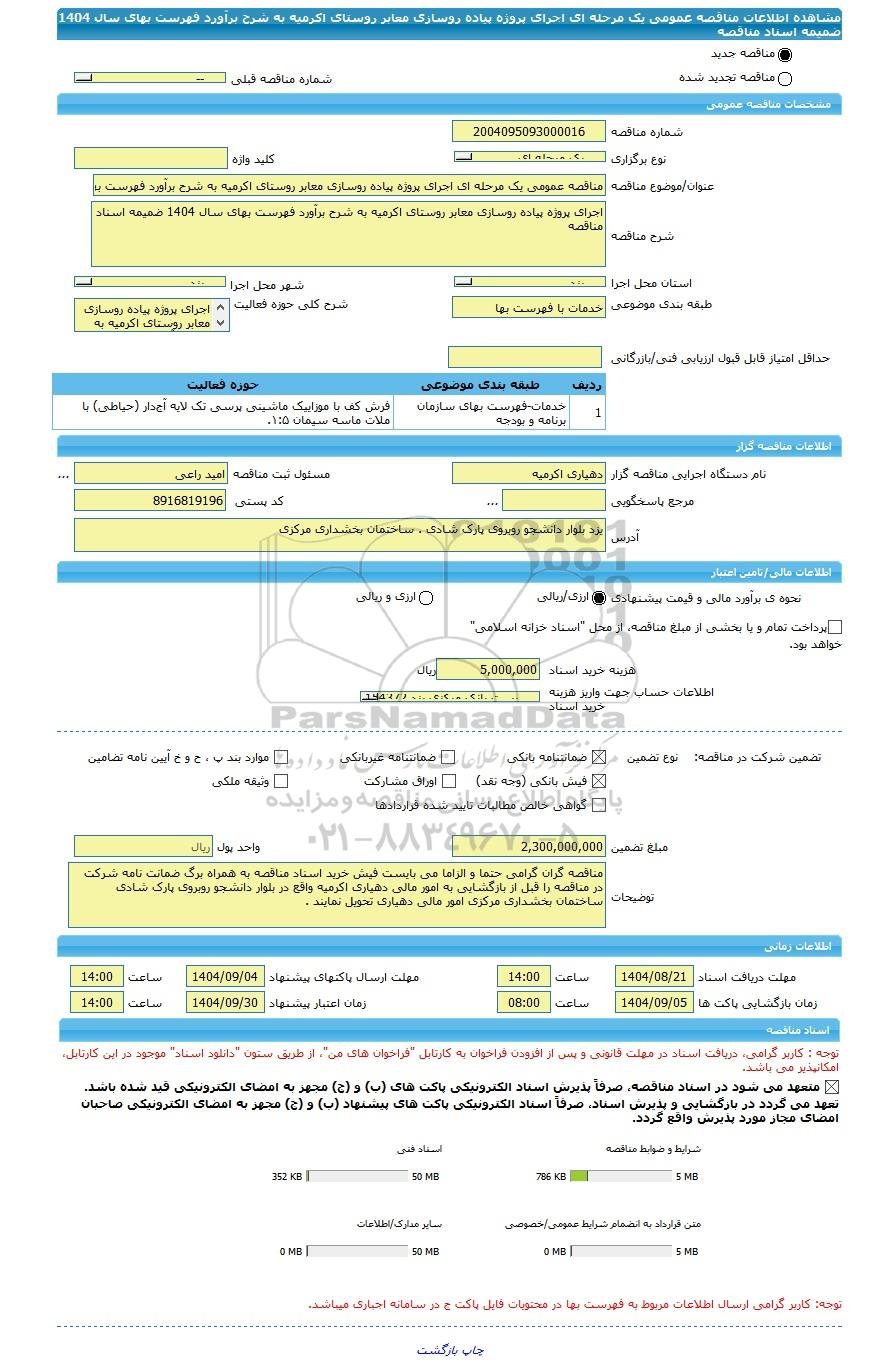 | شرح مناقصه | اجرای پروژه پیاده روسازی معابر روستای اکرمیه به شرح برآورد فهرست بهای سال 1404 ضمیمه اسناد مناقصه | ||||||||