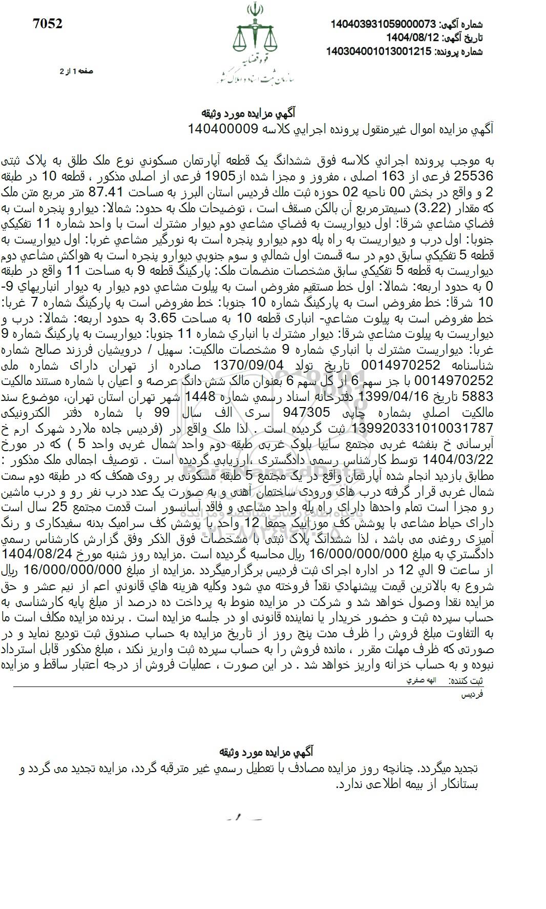 به موجب پرونده اجرانی کلاسه فوق ششدانگ یک قطعه آپارتمان مسکونی نوع ملک طلق به پلاک ثبتی 25536 فرعی از 163 اصلی ، مفروز و مجزا شده از 1905 فرعی از اصلی مذکور ، قطعه 10 در طبقه 2 و واقع در بخش 00 ناحيه 02 حوزه ثبت ملك فردیس استان البرز به مساحت 87.41 متر مربع متن ملک که مقدار (3.22) دسیمتر مربع آن بالكن مسقف است، توضیحات ملک به حدود شمالا دیوارو پنجره است به فضاي مشاعي شرقا اول دیواریست به فضاي مشاعي دوم دیوار مشترک است با واحد شماره 11 تفكيكي جنوبا اول درب و دیواریست به راه پله دوم دیوار و پنجره است به نورگیر مشاعی غربا اول دیواریست به قطعه 5 تفكيكي سابق دوم در سه قسمت اول شمالی و سوم جنوبي ديوار و پنجره است به هواکش مشاعي دوم دیواریست به قطعه 5 تفكيكي سابق مشخصات منضمات ملک پارکینگ قطعه 9 به مساحت 11 واقع در طبقه ه به حدود اربعه شمالا اول خط مستقیم مفروض است به پیلوت مشاعی دوم دیوار به دیوار انباريهاي 9 10 شرقا خط مفروض است به پارکینگ شماره 10 جنوبا خط مفروض است به پارکینگ شماره 7 غربا خط مفروض است به پیلوت مشاعی انباری قطعه 10 به مساحت 3.65 به حدود اربعه شمالا درب و دیواریست به پیلوت مشاعي شرقا دیوار مشترك با انباری شماره 11 جنوبا دیواریست به پارکینگ شماره 9 غربا دیواریست مشترك با انباری شماره 9 مشخصات مالکیت سهیل . درویشیان فرزند صالح شماره شناسنامه 0014970252 تاریخ تولد 1370.09.04 صادره از تهران دارای شماره ملی 0014970252 با جز سهم 6 از کل سهم 6 بعنوان مالک شش دانگ عرصه و اعیان با شماره مستند مالکیت 5883 تاریخ 1399.04.16 دفترخانه اسناد رسمی شماره 1448 شهر تهران استان تهران موضوع سند مالكيت اصلي بشماره چاپی 947305 سری الف سال 99 با شماره دفتر الکترونیکی 139920331010031787 ثبت گردیده است. لذا ملک واقع در فردیس جاده ملارد شهرک ارم خ آبرسانی خ بنفشه غربی مجتمع سایپا بلوک غربی طبقه دوم واحد شمال غربی واحد 5 ) که در مورخ 1404.03.22 توسط کارشناس رسمی دادگستری ارزیابی گردیده است. توصیف اجمالی ملک مذکور : مطابق بازدید انجام شده آپارتمان واقع در یک مجتمع 5 طبقه مسکونی بر روی همکف که در طبقه دوم سمت شمال غربی قرار گرفته دربهای ورودی ساختمان آهنی و به صورت یک عدد درب نفر رو و درب ماشین رو مجزا است تمام واحدها دارای راه پله واحد مشاعی و فاقد آسانسور است قدمت مجتمع 25 سال است. دارای حیاط مشاعی با پوشش کف موزاییک جمعا 12 واحد با پوشش کف سرامیک بدنه سفیدکاری و رنگ آمیزی روغنی می باشد، لذا ششدانگ پلاک ثبتی با مشخصات فوق الذکر وفق گزارش کارشناس رسمی دادگستری به مبلغ 16.000.000.000 ریال محاسبه گردیده است. مزایده روز شنبه مورخ 1404.08.24 از ساعت 9 الی 12 در اداره اجرای ثبت فردیس برگزار میگردد. مزایده از مبلغ 16.000.000.000 ريال شروع به بالاترین قیمت پیشنهادی نقداً فروخته مي شود و کلیه هزينه هاي قانوني اعم از نیم عشر و حق مزايده نقدا وصول خواهد شد و شرکت در مزایده منوط به پرداخت ده درصد از مبلغ پایه کارشناسی به حساب سپرده ثبت و حضور خریدار یا نماینده قانونی او در جلسه مزایده است. برنده مزایده مکلف است ما به التفاوت مبلغ فروش را ظرف مدت پنج روز از تاریخ مزایده به حساب صندوق ثبت تودیع نماید و در صورتی که ظرف مهلت مقرر، مانده فروش را به حساب سپرده ثبت واریز نکند، مبلغ مذکور قابل استرداد نبوده و به حساب خزانه واریز خواهد شد. در این صورت، عملیات فروش از درجه اعتبار ساقط و مزایده تجدید میگردد. چنانچه روز مزایده مصادف با تعطیل رسمی غیرمترقبه گردد مزایده تجدید می گردد و بستانکار از بیمه اطلاعی ندارد.