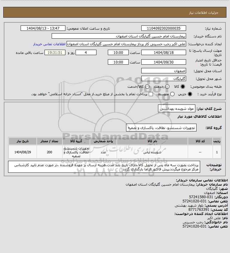 شرح کلی نیاز: مواد شوینده بهداشتی