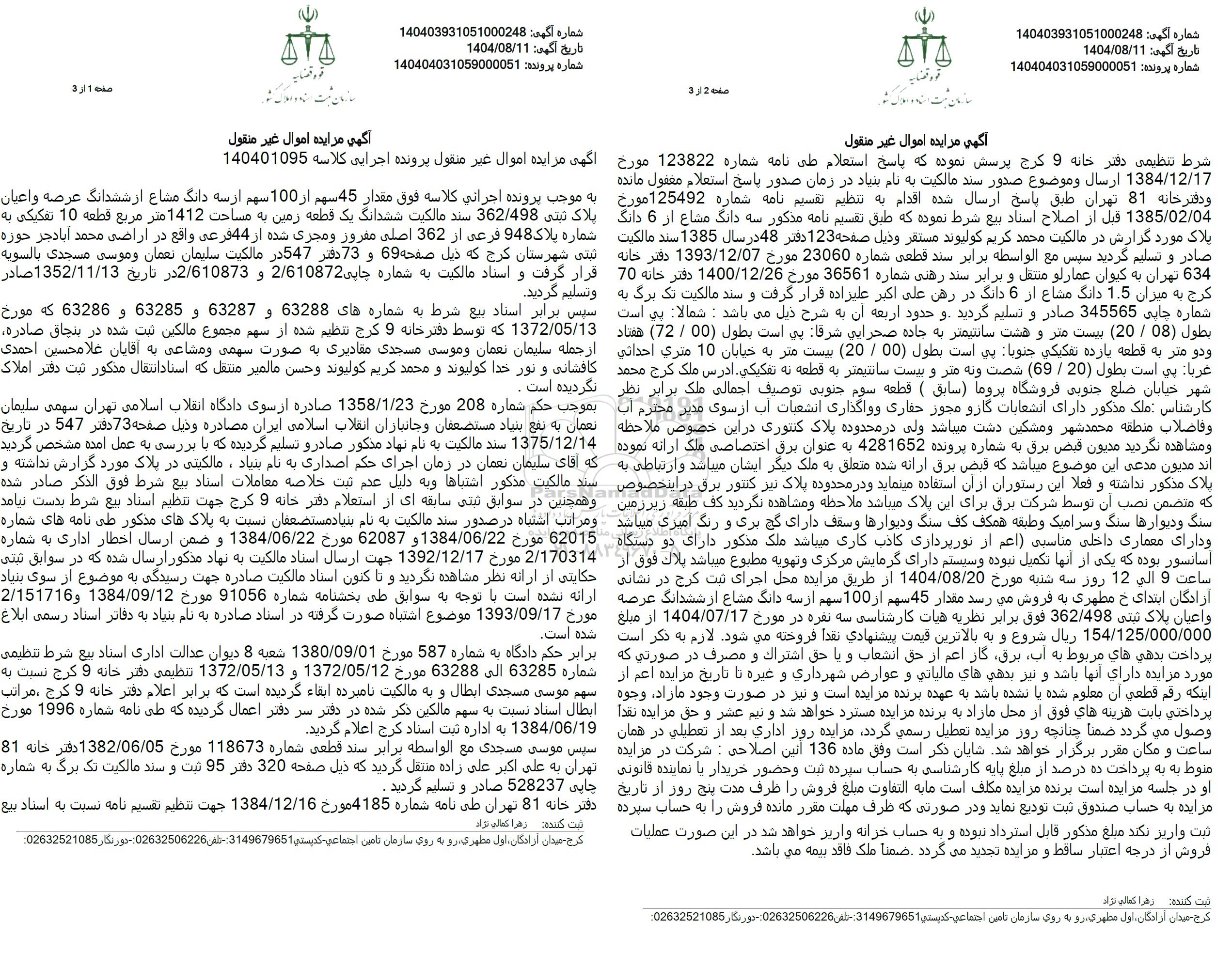 به موجب پرونده اجرائی کلاسه فوق مقدار 45 سهم از 100 سهم از سه دانگ مشاع از ششدانگ عرصه و اعیان پلاک ثبتی 362/498 سند مالکیت ششدانگ یک قطعه زمین به مساحت 1412 متر مربع قطعه 10 تفکیکی به شماره پلاک 948 فرعی از 362 اصلی مقروز و مجری شده از 44 فرعی واقع در اراضی محمد آباد جز حوزه ثبتی شهرستان کرج که ذیل صفحه 69 و 73 دفتر 547 در مالکیت سلیمان نعمان و موسى مسجدى بالسویه قرار گرفت و اسناد مالکیت به شماره چاپی 2/610872 و 2/610873 در تاریخ 1352/11/13 صادر و تسلیم گردید.