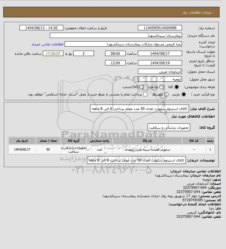 شرح کلی نیاز: کالای استرنوم ساپورت تعداد 50 عدد موعد پرداخت 6 الی 8 ماهه
