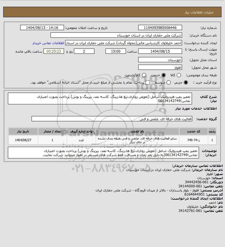 توضیحات خریدار:تعمیر پمپ هیدرولیک شامل (تعویض روتاری،تیغ ها،رینگ، کاسه نمد، بیرینگ و بوش) پرداخت بصورت اعتباری تماس:06134142749(به دلیل بعد زمان و مسافت فقط شرکت های مستقر در اهواز میتوانند شرکت نمایند.